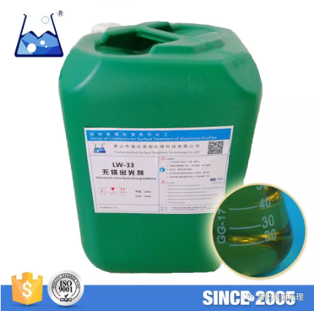 LW-33 is mainly for aluminum profile surface ash removal and brightening after alkaline etching, polishing, alkaline washing, acid washing process, which achieves excellent similar performance comparing to the nitric acid, sulphuric acid, chromium trioxide made.