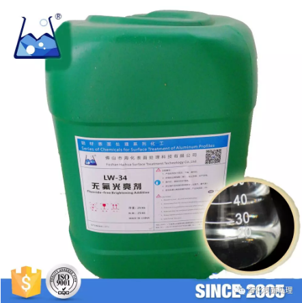 LW-34 is a kind of colorless or light yellow green transparent acid liquid with strong degreasing factor and contains the brightening agent, penetrating agent, emulsifier and other functional agents, can quickly and effectively remove aluminum surface grease, stains and natural oxidation film to make the aluminum bright as new. LW-34 is of fluoride-free and environmental friendly, comparing to the traditional fluoride brightener and traditional alkaline etching processing, it has the advantages of low cost, little aluminum consumption, energy- saving and environmental protection etc.